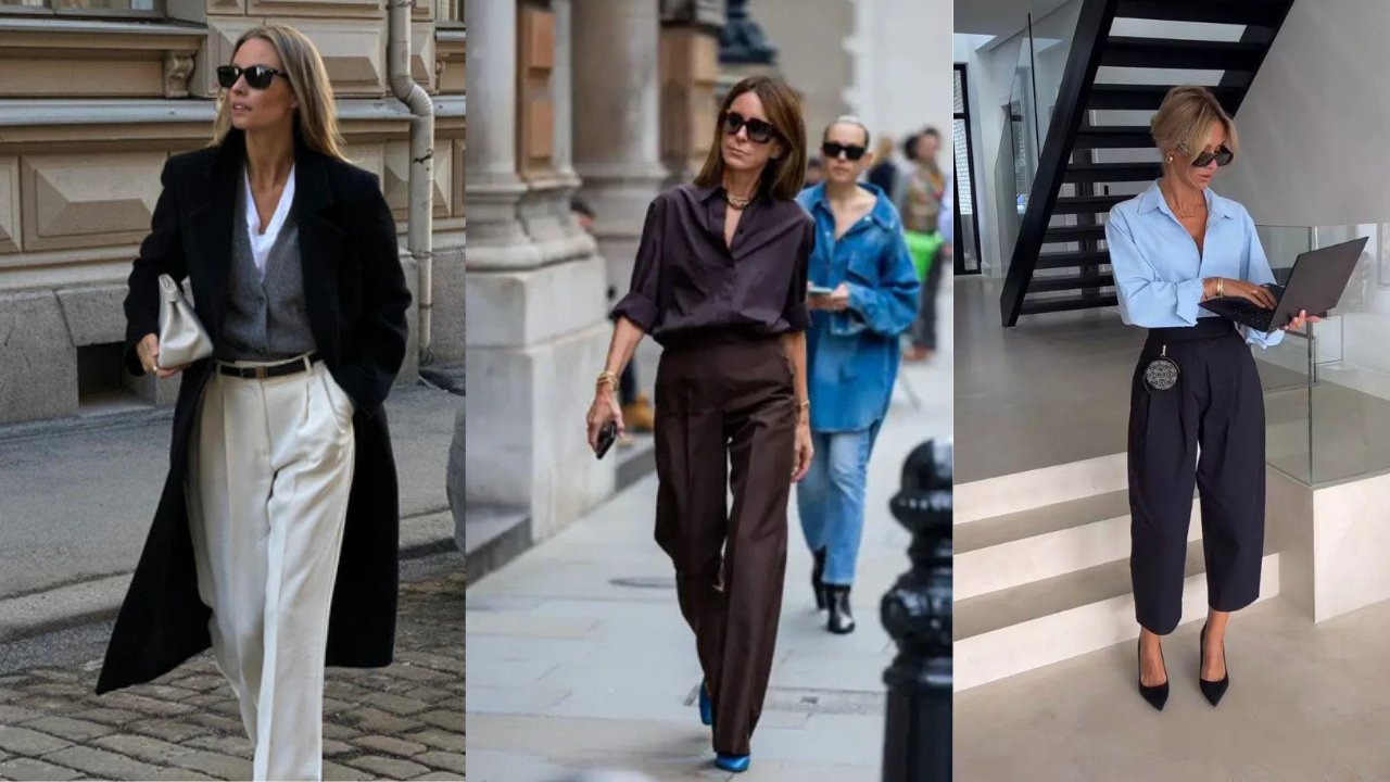 Siyah düz paça pantolonlar klasik ofis stilinin temel taşı olmayı sürdürüyor. Hafif geniş paça kesimler daha modern bir hava sağlıyor. Topuklu ayakkabı, loafer ya da babetle kolayca kombinlenebilen bu parça, hem resmi toplantılar hem günlük ofis kombinleri için ideal.