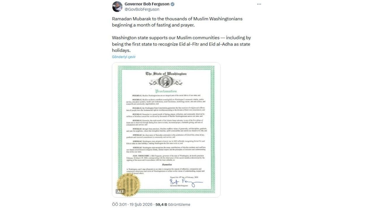 Washington Valisi Bob Ferguson, eyalet sınırları içerisinde yaşayan Müslüman toplumun kültürel ve toplumsal katkılarını onurlandırmak amacıyla ramazan ayının resmen tanındığını ilan etti. Sosyal medya platformu X üzerinden açıklamalarda bulunan Vali Ferguson, Müslümanların eyaletin genel yapısındaki kritik rolüne dikkat çekerek, 18 Şubat ile 19 Mart 2026 tarihleri arasını kapsayan dönemi ramazan ayı olarak tescilledi.