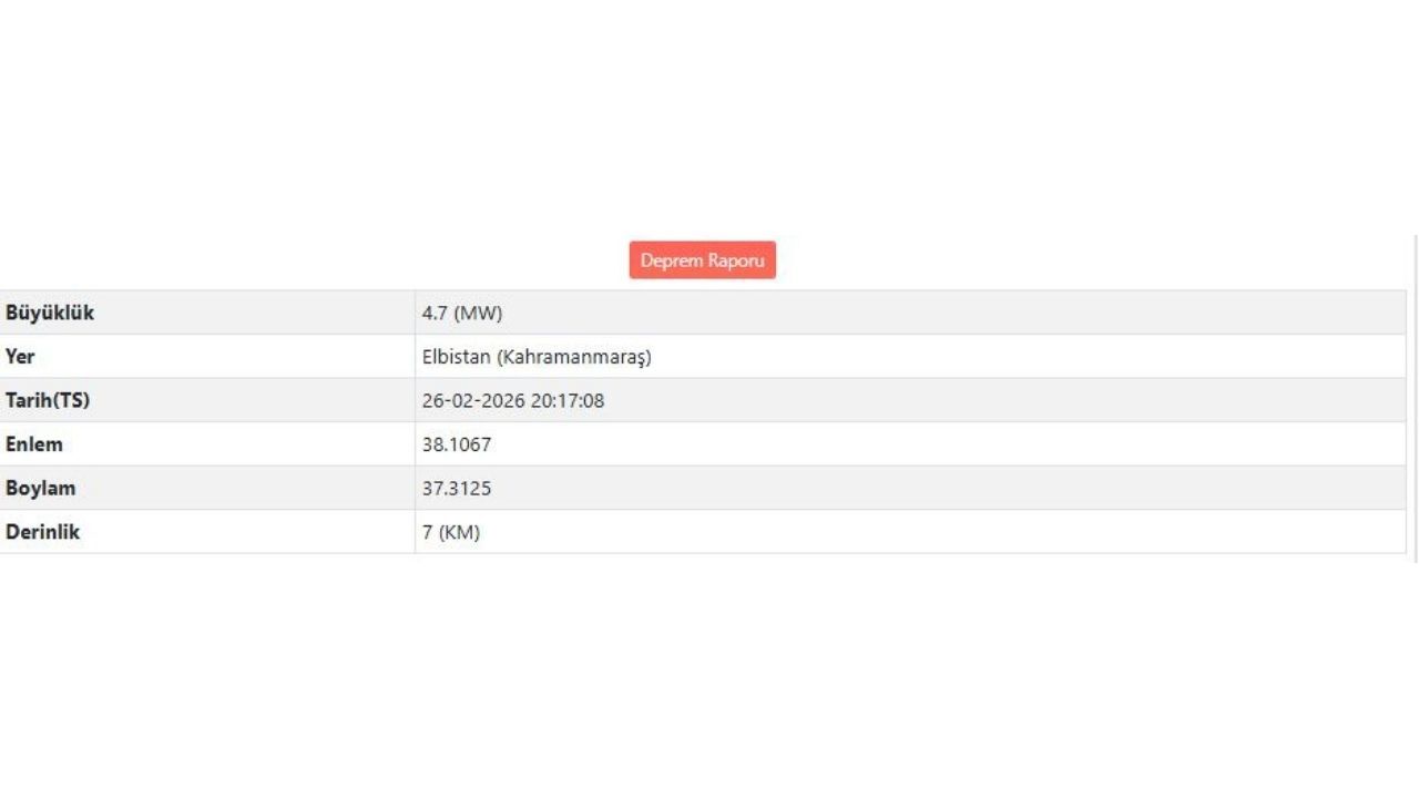 Afet ve Acil Durum Yönetimi Başkanlığı (AFAD) tarafından paylaşılan verilere göre, Kahramanmaraş'ın Elbistan ilçesinde saat 20.17'de yerin 7 kilometre derinliğinde 4.7 büyüklüğünde bir sarsıntı yaşandı. Bölge genelinde hissedilen depremin ardından ilgili tüm birimler teyakkuza geçirilerek saha incelemelerine başlandı.
