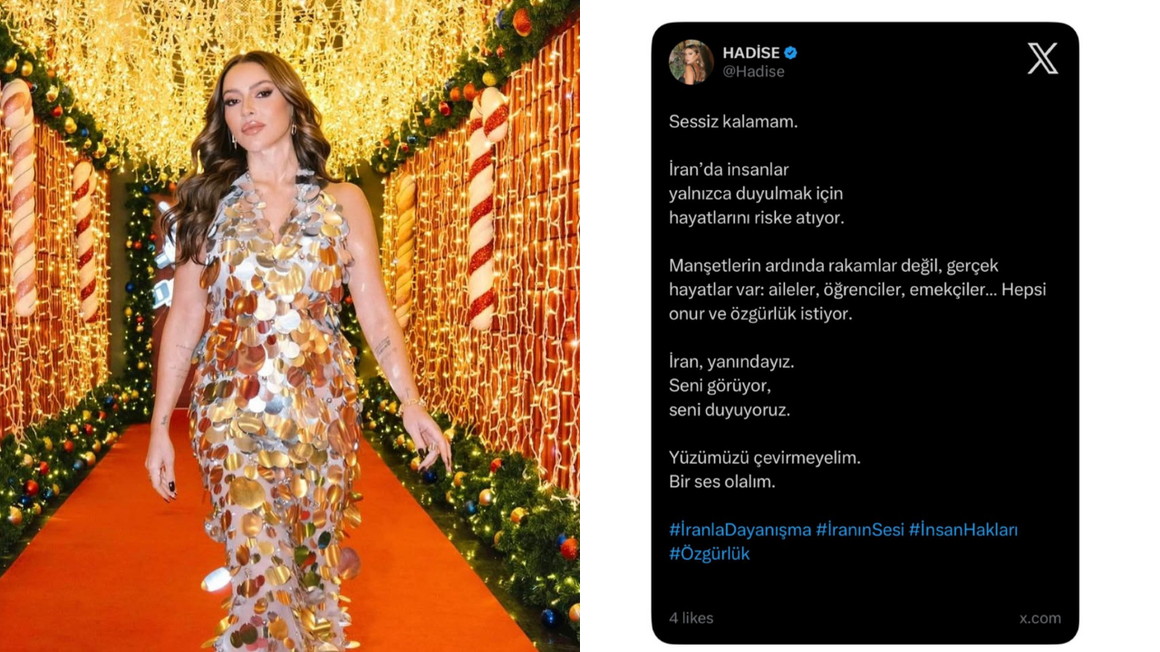 Yaşanan gelişmelerin ardından sosyal medya hesabından paylaşım yapan Hadise, İran halkının yaşadıklarına sessiz kalamayacağını ifade etti. Ünlü şarkıcının paylaşımı kısa sürede geniş kitlelere ulaştı.