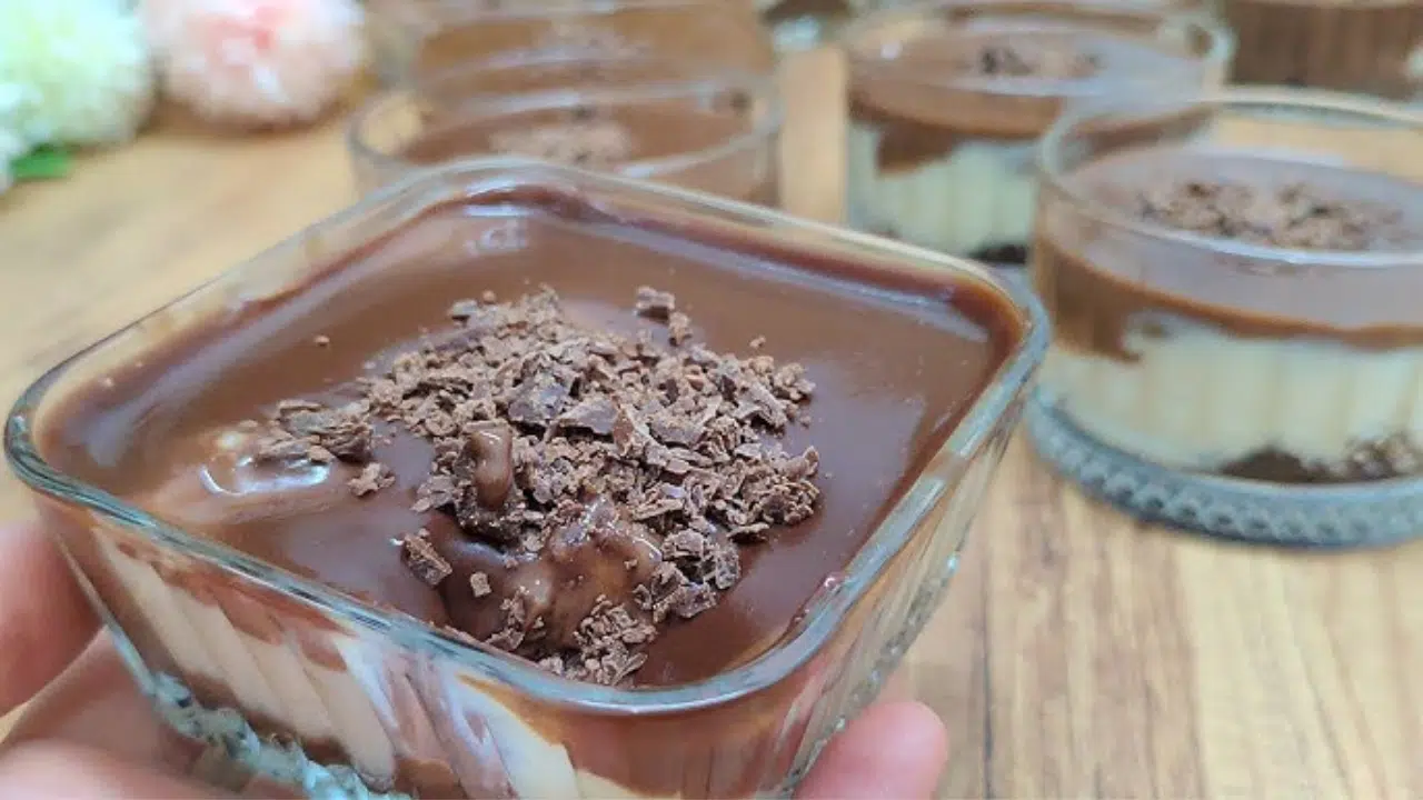 - Son katmanı ekleyin: Hazırladığınız çikolata sosunu, muhallebi kremasının üzerine boşluk kalmayacak şekilde dökün.